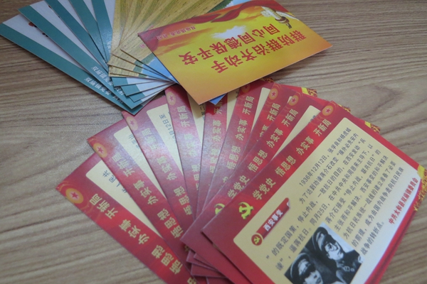豆庙村总支书记赵玉深说:“我们一天很多时间都在下乡走访的路上,集中学习的时间有限,这种卡片式学习,便于携带又方便记忆,休息的时候拿出来看一看,大家再互相交流一下,就记住了。”