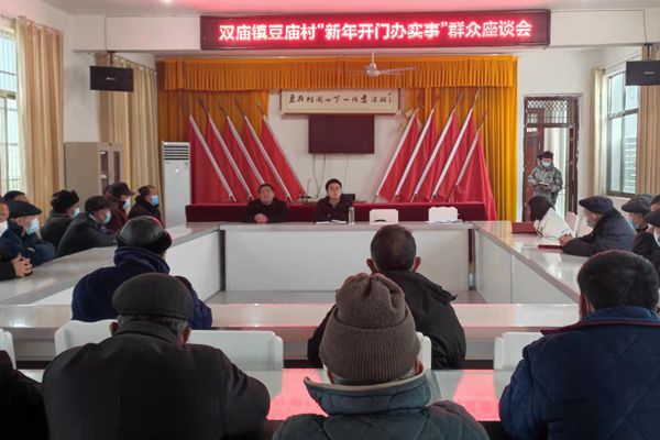 为全面落实全省改进工作作风为民办实事为企优环境大会精神,2月18日,双庙镇豆庙村召开“新年开门办实事”座谈会,镇党委副书记、镇长王龙参加座谈会并讲话,村两委成员,30余名群众参加会议。