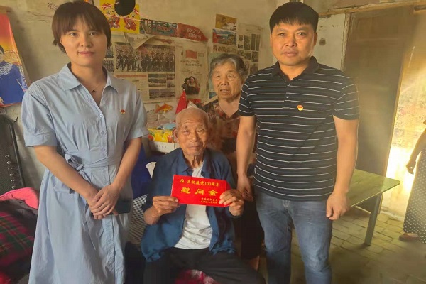 7月1日,蔡庙镇党委书记刘伟一行人在村书记范兆德的陪同下,走访慰问了辖区内党龄满50周年老党员刘廷香等人,为老党员们送去“光荣在党50年”纪念章和慰问金,并送上真挚的祝福。