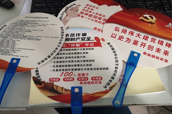 扇子上印有习近平总书记“七一”重要讲话的金句、党史小故事、防范“诈骗”宣传标语,以朴实无华的话语提醒群众警惕诈骗,保护群众免受财产损失。一把普通的扇子拉近了干群关系、传递出为民服务的职责。