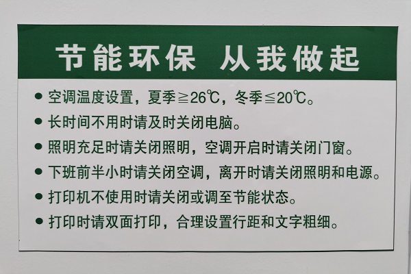 一是把好办公资源关。加强对办公耗材的使用管理,提倡双面用纸,鼓励二次利用废旧纸张,节约对纸、墨等耗材的使用。在用水区设置“节约用水”标志,把照明灯更换为LED节能灯,走廊、楼梯安装声控灯,杜绝“长流水、长明灯”现象的发生。在空调旁张贴“节能环保、从我做起”提醒贴纸,并安装用电量监测插座,帮助大家养成良好的用电习惯。二是把好节约粮食关。开展以“勤俭节约、杜绝‘舌尖上的浪费’”为主题的光盘行动,引导干部做到勤俭节约用餐,让拒绝餐桌上的浪费成为大家的自觉行动。鼓励干部把良好的节约习惯带入家庭、带入社会。