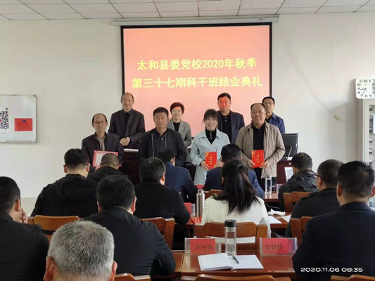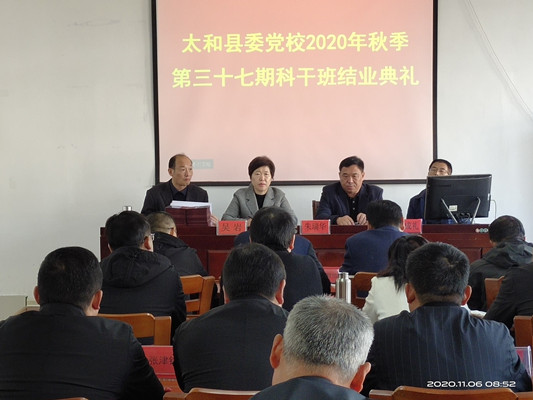 近日,太和县委党校举行了2020年秋季主体班结业典礼,县委组织部副部长朱瑞华出席并作了重要讲话,县委党校常务副校长吴岩主持结业典礼,县委组织部干训室主任张鸿申、县委党校副校长贾成礼出席。