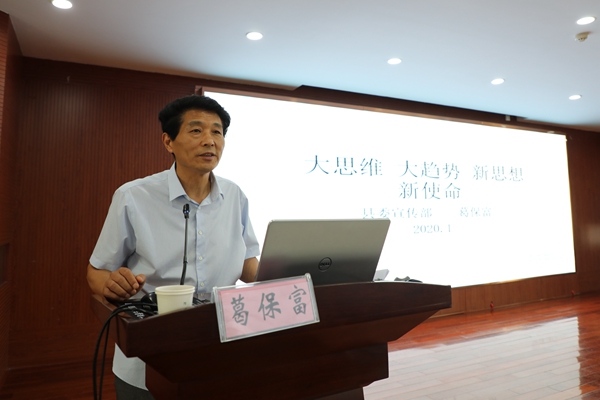 葛保富以《大思维、大趋势、新思维、新使命》为主题,以各国新冠肺炎疫情应对和国际民粹主义、保护主义抬头等破题,围绕百年未有之大变局、大趋势,中国共产党的大思维,新思想开辟新时代、新局面,担负起应该担负的使命等4方面系统阐述中国共产党冷静、科学、理性、法治的抗疫智慧和习近平新时代中国特色社会主义思想的深刻内涵。