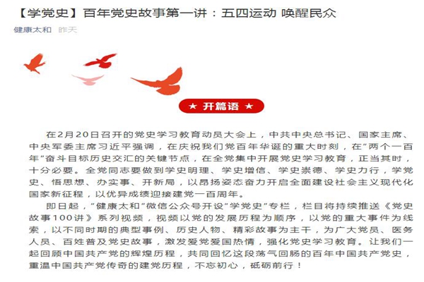 根据党史学习教育部署,太和县人民医院党委在官方微信开辟百年党史故事专栏,回顾中国共产党的辉煌历程,重温中国共产党的建党历程,引导党员干部把党的历史学习好、总结好、传承好、发扬好。