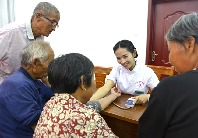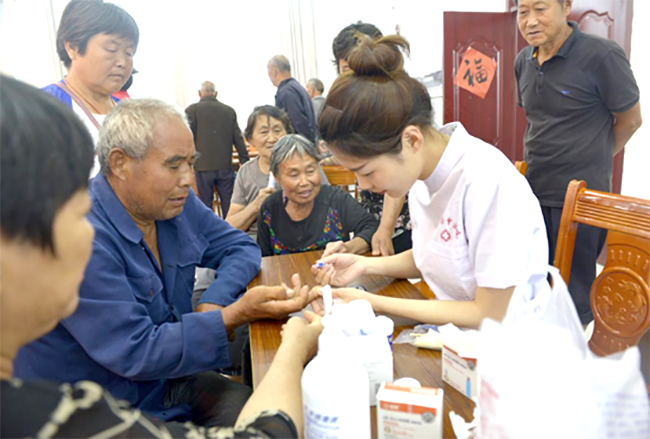 手术室健康教育骨干李小林、新生儿科健康教育骨干李慧为村民群众测量血糖血压。