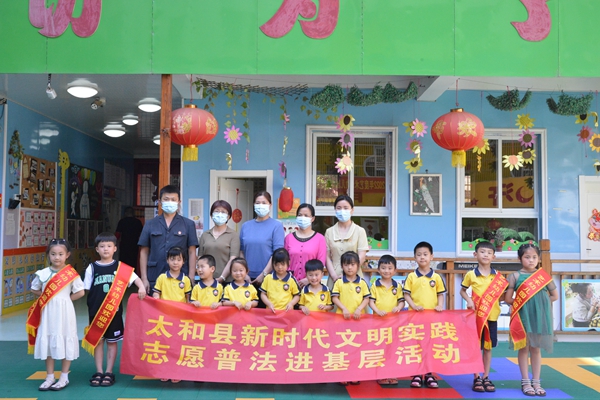 为响应太和县新时代文明实践集中活动的号召,充分发挥文明实践阵地功能,让文明实践活动接地气、贴民心、多元化、常态化,2022年6月14日下午,太和县人民法院普法志愿者受太和县艺术幼儿园的邀请,与团县委、妇联共同开展了志愿普法进基层活动。