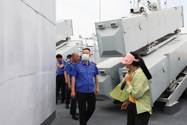 在解说员的解说下,党员干部们怀着敬仰的心情登上英雄战舰,细心聆听了南海舰艇在中国人民解放军驻香港部队某舰艇大队服役24年的南海772艇的光辉事迹。“1997年7月1日,作为首批进驻香港履行防务使命的舰艇,南海艇与其他12艘舰艇奉命进入昂船洲军营。进驻以来,南海艇传承弘扬“海上先锋精神”,先后参加重大演习演练活动20余次,圆满完成北京奥运会香港赛区安保警戒、联合海空巡逻、海上搜救等大项任务60余次,在各类军营开放活动中,接待香港市民参观30余万人次。”解说员动情地说道。
