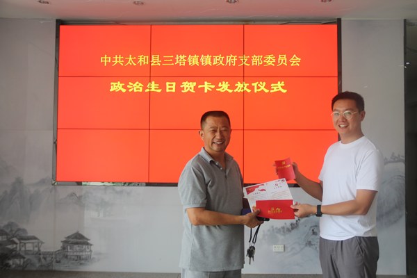 一是发放贺卡。三塔镇组织委员、镇政府党支部书记陈步云将写着入党誓词和生日寄语的贺卡交到三位同志手中,并代表党组织向他们表示热烈的祝贺。希望他们进一步坚定理想信念,把准政治方向,牢记党的宗旨,以务实行动履行入党誓词,以工作实绩践行初心使命,开拓创新,锐意进取,永葆共产党员的先进性。