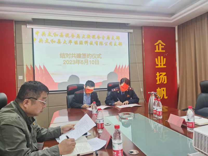 为加强非公党建抓手,5月11日,太和县税务局大新税务分局党支部与太和县大华能源科技有限公司党支部签订基层党组织结对共建协议,以此推动党建资源共享、党建经验共融、党员素质共强,促进企业快速发展、转型升级,构建“亲”“清”政商关系。