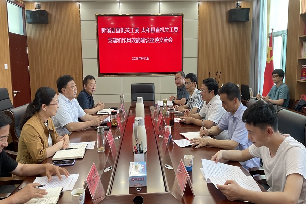 6月1日-2日,郎溪县直工委书记刘波、副书记黄少群等一行4人来太开展党建和作风效能建设工作考察调研,太和县直工委书记王道峰、副书记周重建、邹丽陪同调研。座谈会上,王道峰同志对郎溪县一行来太调研交流表示欢迎,详细介绍了太和经济社会发展情况、太和县直机关党建和作风效能建设工作开展情况的经验做法。