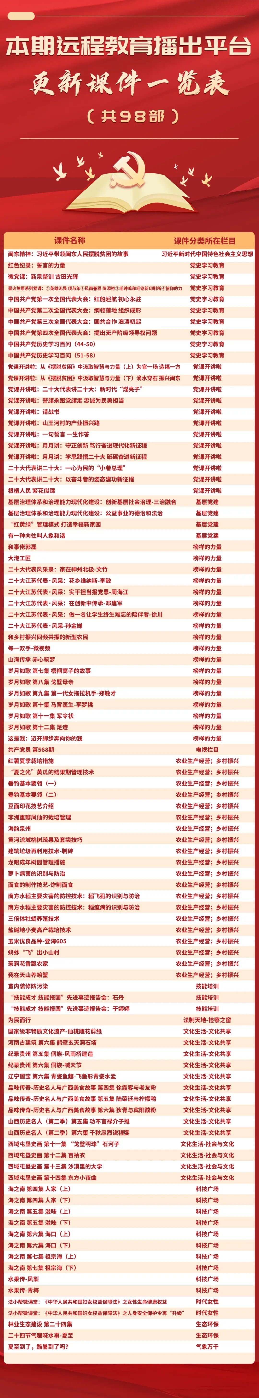 为进一步提升党员远程教育学用结合实效,帮助全省基层远程教育终端站点更便捷地掌握课件资源库内容,省党员电教中心通过安徽先锋微讯定期发布精品节目推荐以及最新上传更新节目单,请通过远程教育终端站点或安徽先锋网-先锋网视点播收看。