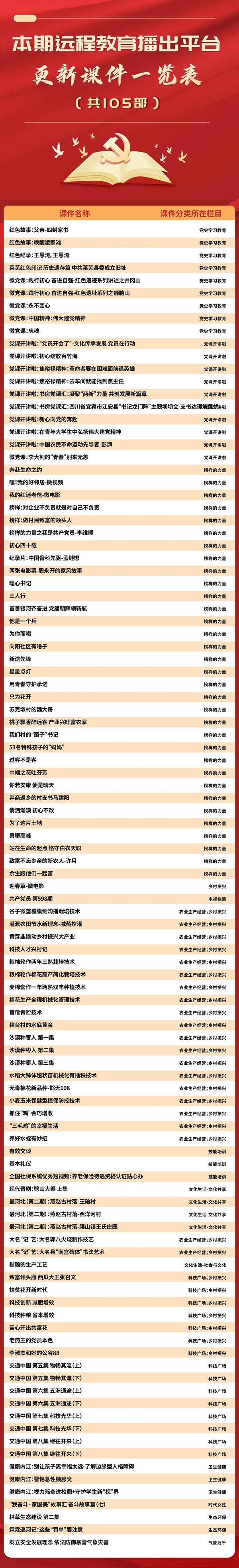 为进一步提升党员远程教育学用结合实效,帮助全省基层远程教育终端站点更便捷地掌握课件资源库内容,省委组织部党员教育中心通过安徽先锋微讯定期发布精品节目推荐以及最新上传更新节目单,请通过远程教育终端站点或安徽先锋网-先锋网视点播收看。