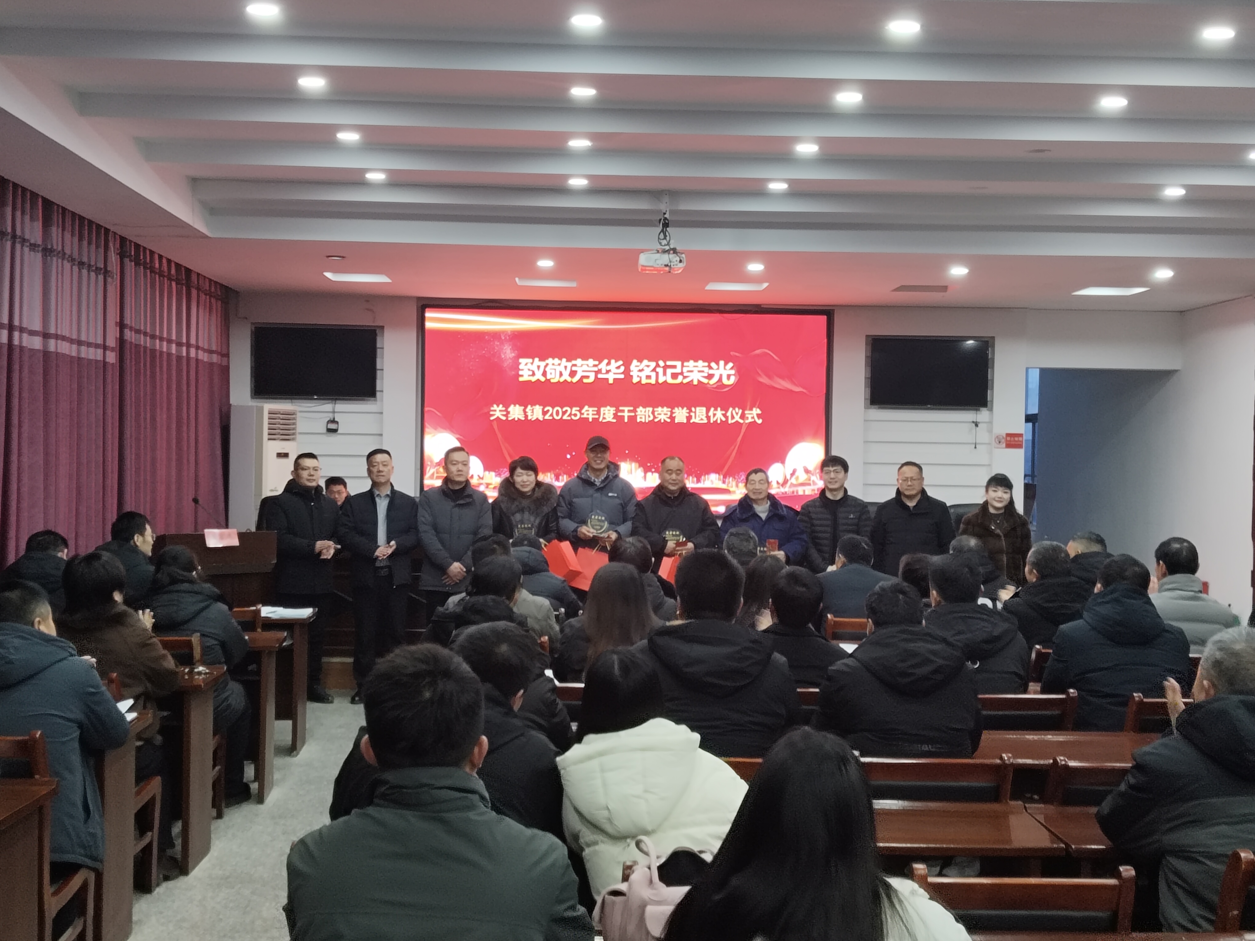 1月26日,关集镇党委举办2025年度荣誉退休仪式,以庄重简朴的形式欢送光荣退休同志。镇领导班子成员、相关部门负责人及青年干部代表齐聚一堂,共同回顾退休同志的奋斗历程,传承优良作风。