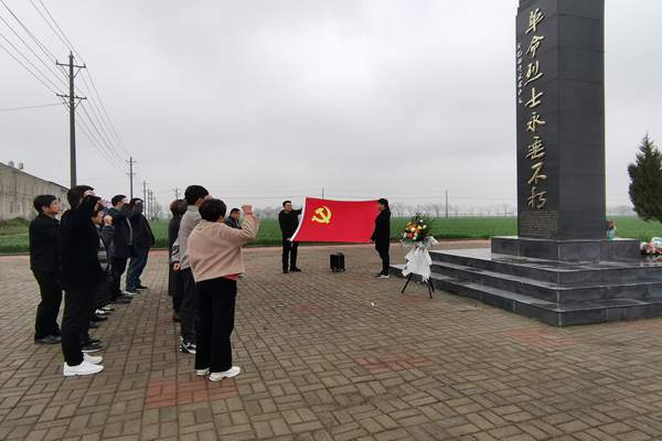 会后,全体镇干部来到原墙镇曹庄寨烈士陵园。仲春时节,细雨微风,翠柏静默。大家肃立于革命烈士纪念碑正前方,庄严的革命烈士纪念碑,巍峨矗立。大家接替缓步走上前去,敬献鲜花,面对着鲜红的中国共产党党旗,学员们集体重温了入党誓词,表达着对革命烈士的深切缅怀和无限敬仰。