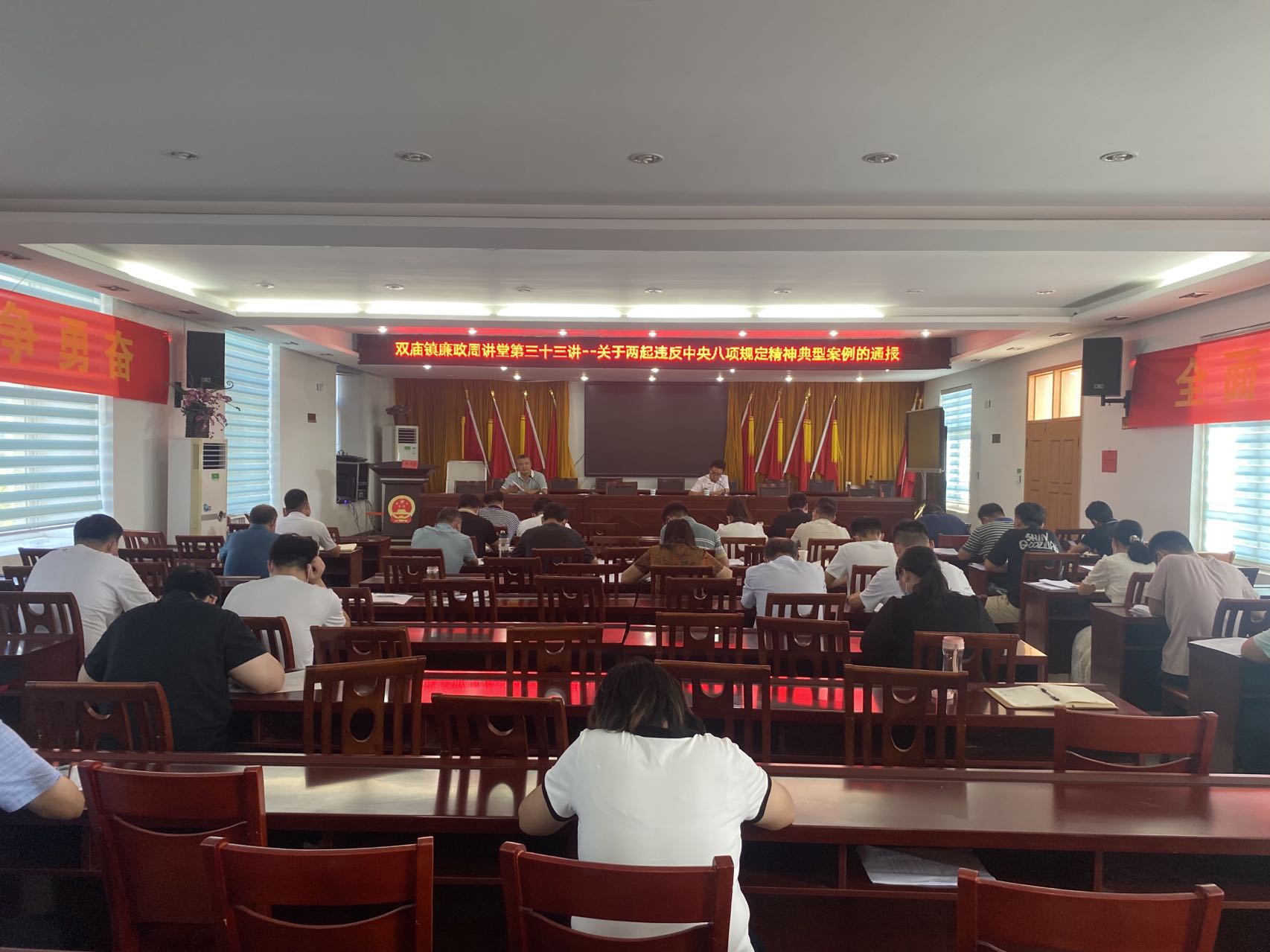 为进一步严明工作纪律,深入贯彻中央八项规定精神和作风建设要求,持续正风肃纪,8月8日上午,双庙镇召开会议集中学习《关于两起违反中央八项规定精神典型案例的通报》,镇全体干部参加会议。