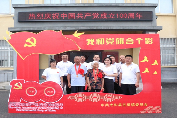 五星镇在新时代文明实践所、文化广场等人流密集场所设置“我和党旗合个影”拍照打卡点,引导镇村党员群众与党旗合影,用生动活泼的形式表达党在心中、团结一心、积极向上的精神风貌。6月26日,在党的百年华诞即将来临之际,五星镇召开庆祝中国共产党成立100周年暨 “七一”表彰大会。会后,受表彰的“光荣在党50年”老党员和优秀共产党员、优秀党务工作者及优秀队组长参观了百年党史图片展,并共同参与了“我和党旗合个影”活动,用镜头定格信仰,记录珍贵瞬间,向党的百年华诞献礼。