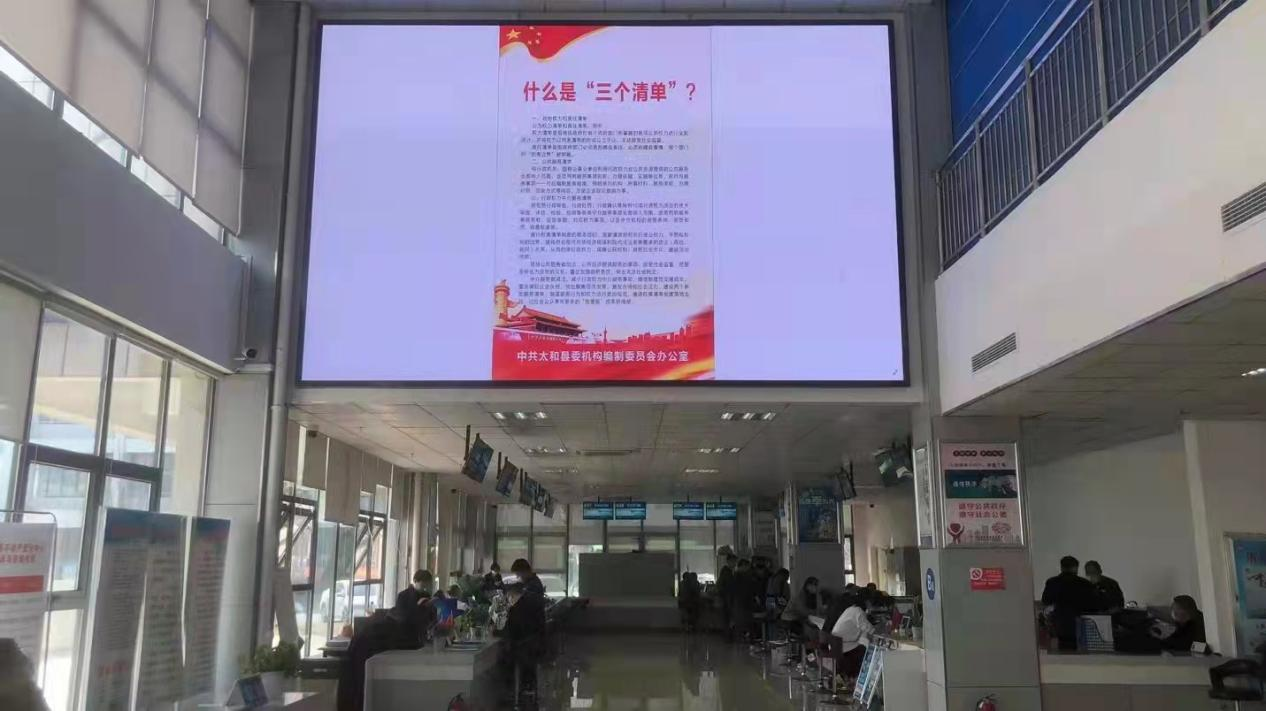近日,县委编办借助县政务服务中心宣传优势,利用大厅内的电子屏滚动播放《“三个清单”目录》、《什么是“三个清单”》等资料,向社会公开太和县人民政府各部门目前保留的事项清单目录。这是县委编办首次通过电子屏滚动播放的方式,“晒”出权力清单、亮出“权力家底”,更是推动政府职能转变、深化行政审批制度改革、便企利民的重大举措。