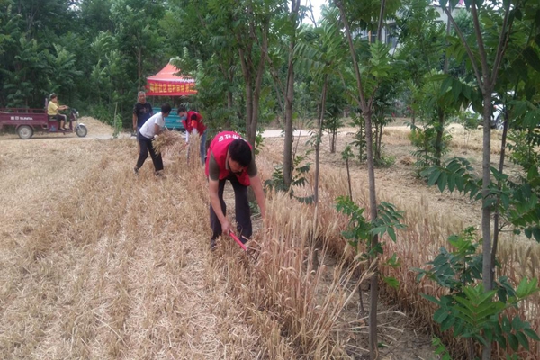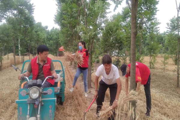 陶桥社区党总支书记李晓莉得知这一情况后,立即组织党员志愿者,第一时间行动起来。天气虽不像前几日炎热,但有要下雨的迹象,李晓莉带领志愿者在田间香椿树下帮助抢收,大家分工明确,齐心协力,用三轮车将收割的小麦及时拉到老人家中。老人看到大家都在帮忙,自己也拿起镰刀割了起来。经过一小时的忙碌,终于将老人树旁的小麦抢收完毕,拉回家中,及时解决了贫困老人心头的一件大事。