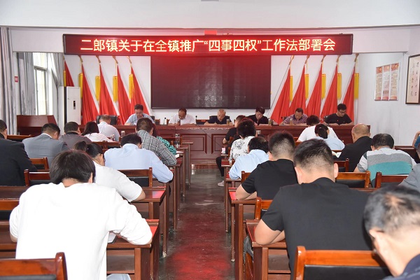 一是加强组织领导。成立由镇党委书记任组长、镇长任副组长、镇班子成员任成员的“四事四权”工作法领导小组,抽调专人负责,二郎镇通过会议动员部署,镇级制定了实施方案及行事历,村级制定了实施计划。
