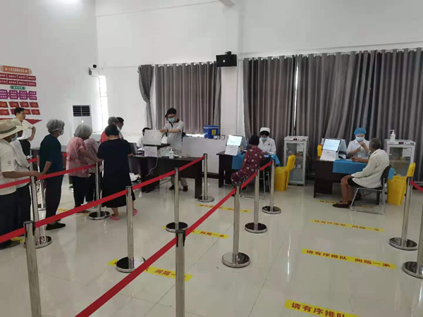 7月9日是孙庄村疫苗接种点试接种的第一天,孙庄村双基广场人来人往,新冠疫苗接种台前有不少村民排队等待。该接种点各项设施齐全,接种流程规范,预检、登记、接种、留观等每个环节都有条不紊,区域划分明确,并有相关人员和志愿者指引。